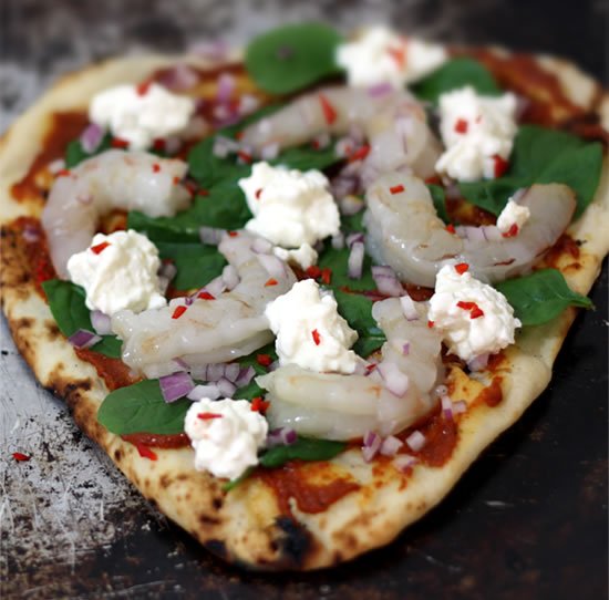Naan bread works best with this pizza, but if you can’t get your hands on any, pita bread makes a reasonable substitute. Also, instead of shrimp you can use diced chicken, scallops, chickpeas or even good quality canned tuna or salmon. And of course paneer cheese (cut into small cubes) can be used instead of the cottage cheese.