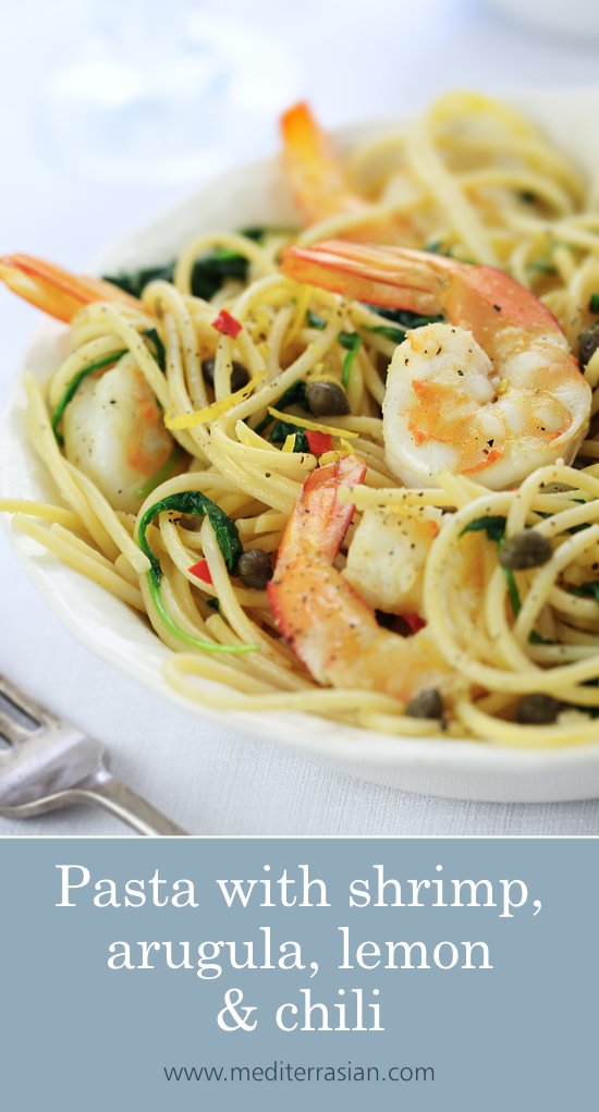 If you’re not a fan of shrimp, you can make this dish with sautéed scallops or chicken. You can also use fresh baby spinach leaves rather than arugula, and dried red chili flakes as an alternative to fresh red chili.