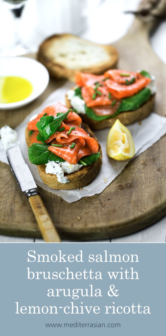 The ricotta is turned into a creamy spread by adding chopped chives, lemon and freshly ground black pepper. And it combines beautifully with peppery arugula (rocket) and slices of delicate smoked salmon — which also happens to be rich in heart-healthy omega-3 fats.